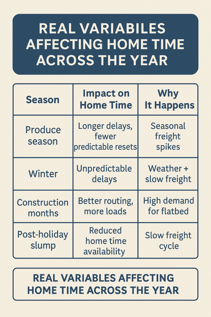 The second myth comes from the thinking that there are no limits to home time. Some drivers get it wrong when they hear “You are going to be home every weekend,” they believe that means the entire year. However, freight can vary monthly and that variation can be considerable. After a seasonal/festival break, some routes become less active. The produce season floods the reefer market, which is an imbalance. Flatbed related building seasons go high, then disappear. These situations directly affect driver’s home time, for instance a good plan in June may no more be available in October. This again is connected to scheduling myths and unrealistic expectations related to home time, showing how fragile work-life balance trucking can be when managing personal life depends on things no one can control.